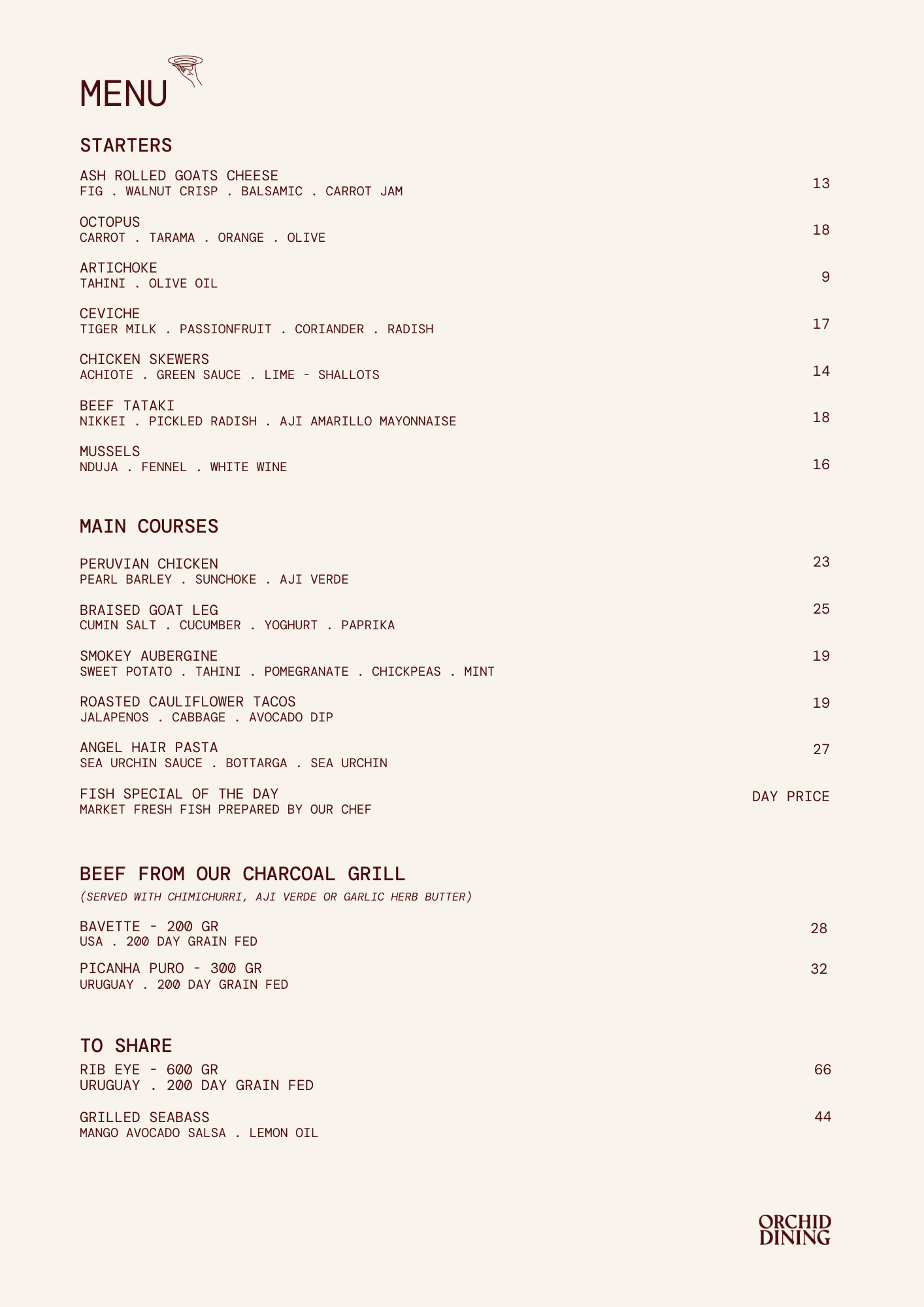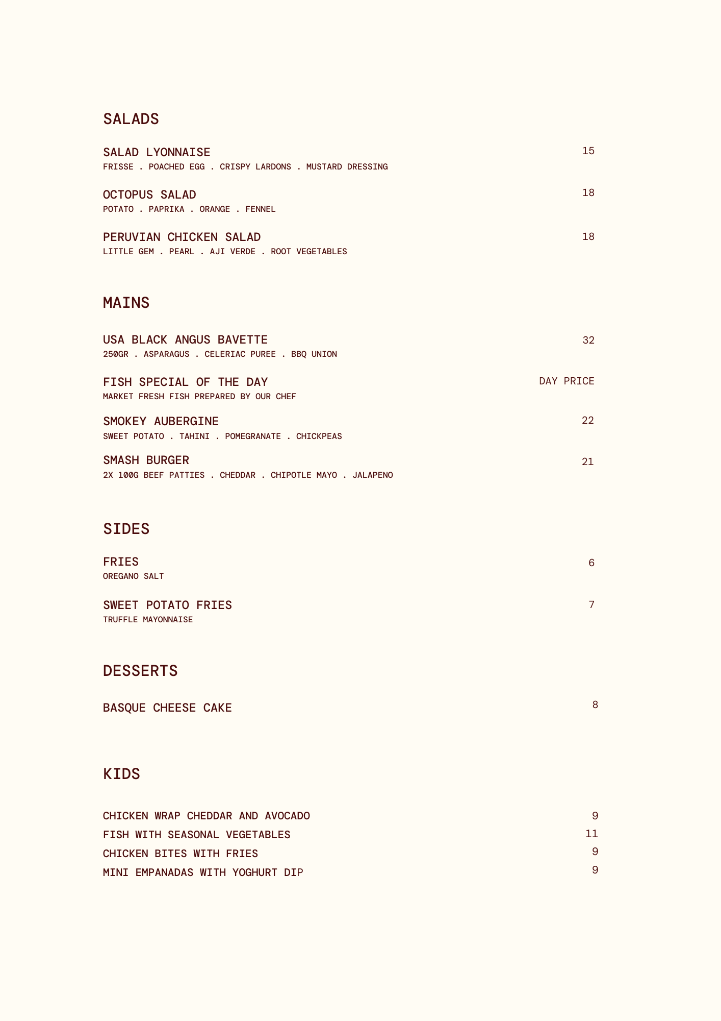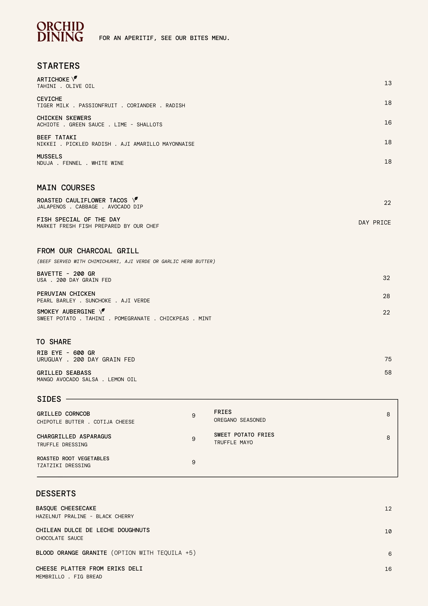 Our lunch and dinner menu follows the seasons. It’s Mediterranean at heart with a Latin twist. Expect vibrant plates, smoky flavours from the grill, brightness from fresh herbs, and desserts that are impossible to skip.