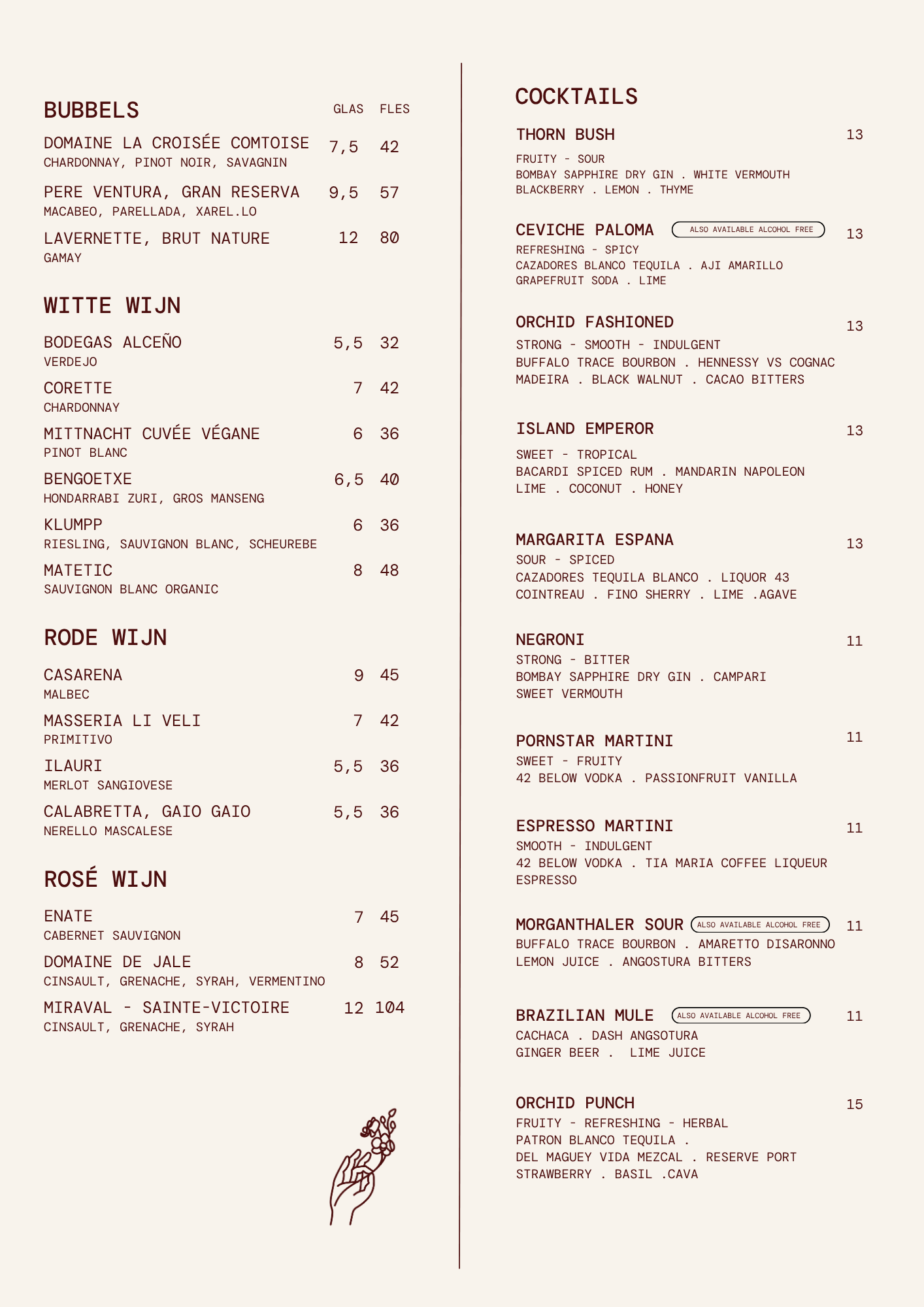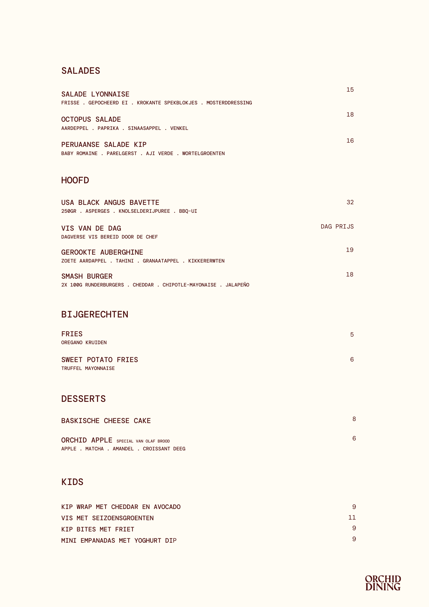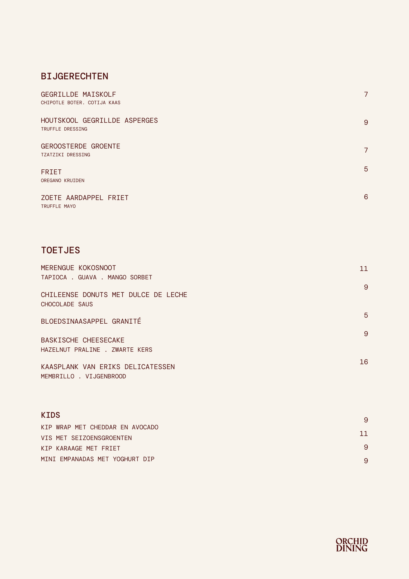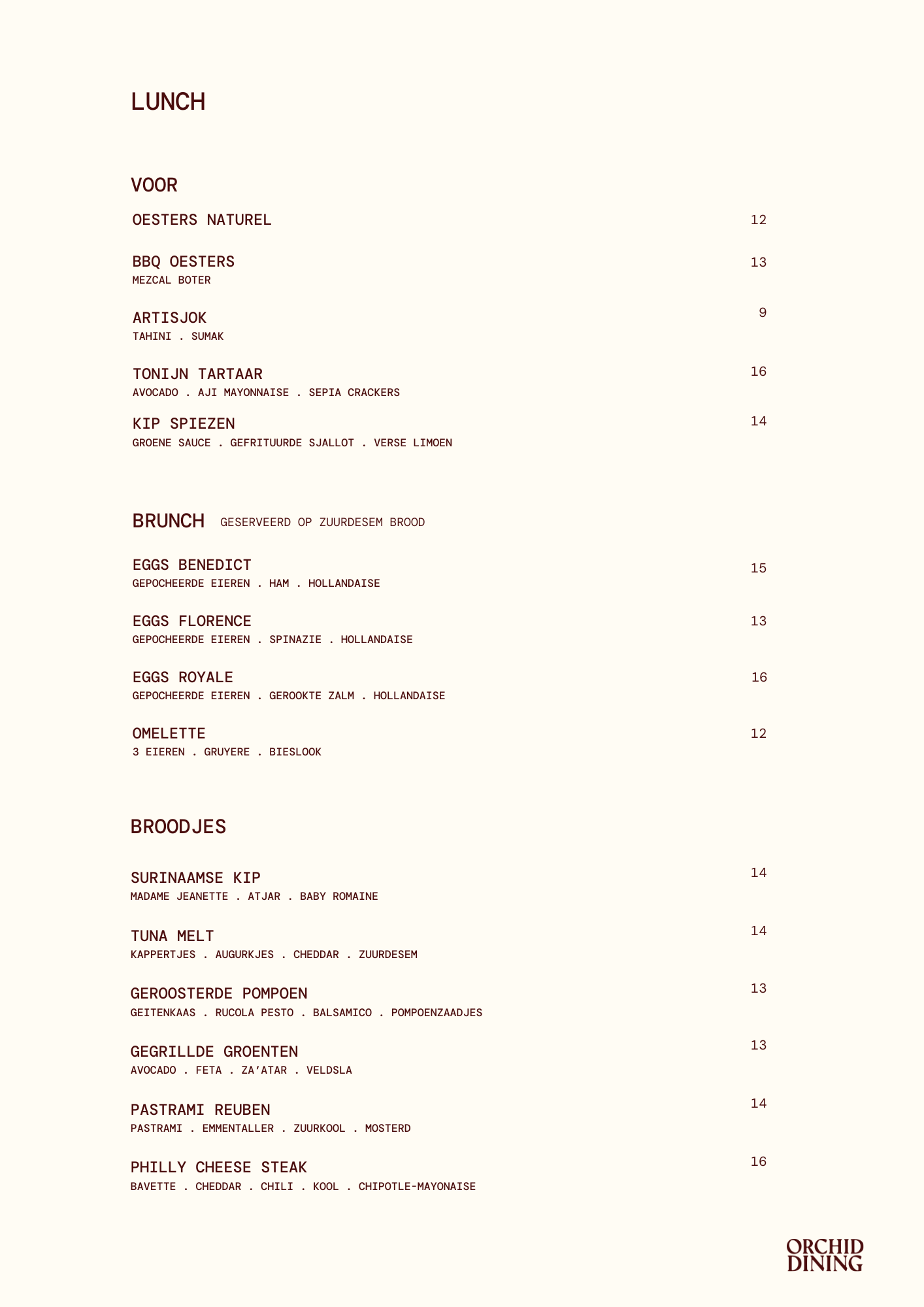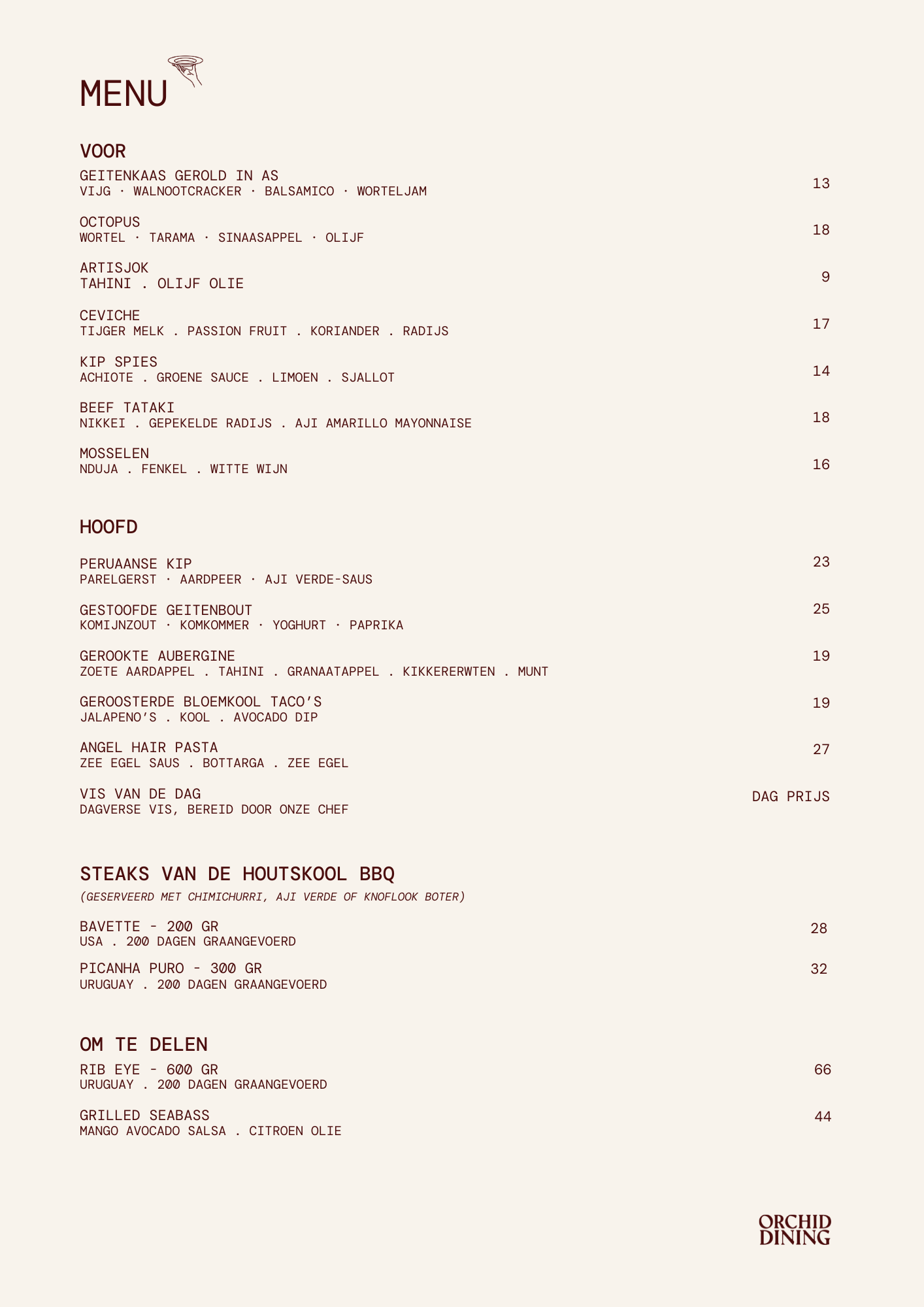 Onze lunch- en dinerkaart volgt de seizoenen. In de basis het Mediterraans maar we geven gerechten een Latijns-Amerikaanse twist. Verwacht levendige gerechten, rokerige smaken van de grill, frisse kruiden en toetjes die je niet wil overslaan.